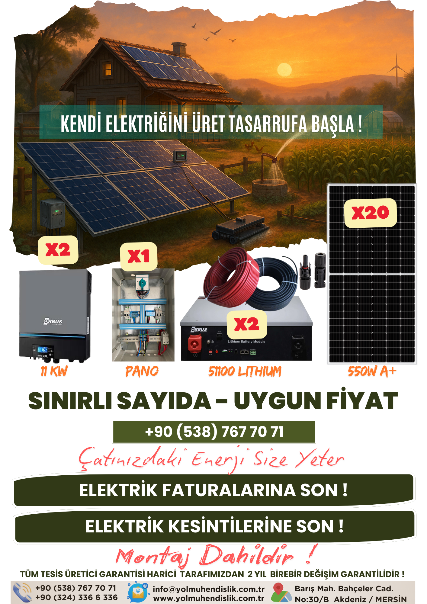Güneş enerjisi sisteminin en büyük avantajı, güneşten elde edilen enerjiyi kullanarak elektrik maliyetlerini önemli ölçüde düşürmesidir. 22 Kw Monofaze GES, ihtiyacınıza uygun enerji üretme kapasitesine sahip olup, çevre dostu bir alternatif sunar. Bu sistem, hem çevreye duyarlı bir yaşam tarzını destekler, hem de enerji bağımsızlığınızı artırır.